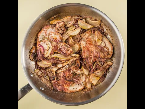 - Adaugă ceapa și perele feliate și gătește până la 7-8 minute. Aruncă în tigaie și câteva crenguțe de cimbru.