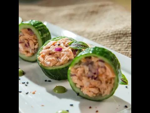 - Scobește și înlătură pulpa din feliile de castravete, apoi umple cu compoziție de somon cu ceapă.