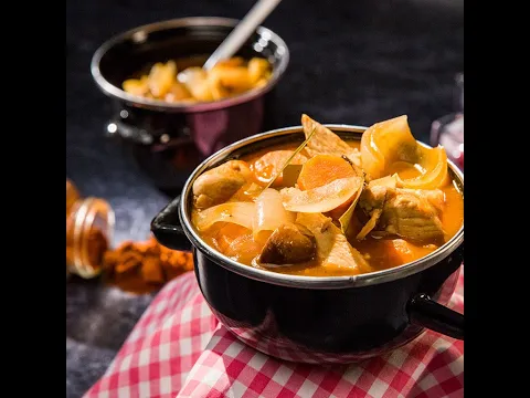 - Toarnă apa, adaugă usturoiul, paprika, foile de dafin, sosul Worcester, pudra de cuișoare și sare de mare cu piper, după gust.